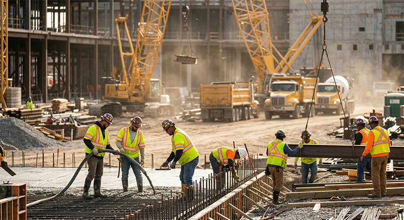 Công trường có nhiều bộ phận làm việc